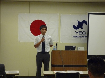 | 自己紹介をする新会員の牧くん | 緊張の面持ち・・・司会の曽根総務委員長! |